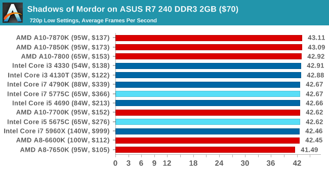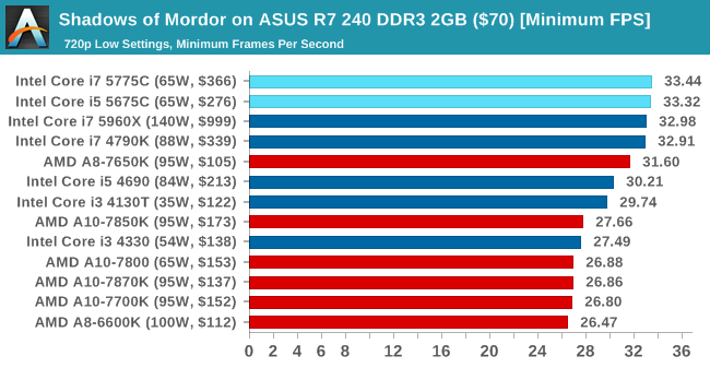 En Alien Isolation con ajustes en ultra podemos jugar sin problemas y de forma totalmente fluida con la Iris Pro 6200, como se aprecia en la gráfica, superando en 12 FPS a la A10-7870K.