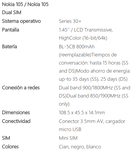 Habrá dos variantes del Nokia 105, una solo soporta una única SIM mientras que la otra es Dual SIM, y ambas se venderán en tres colores distintos, cian, negro y blanco. La pantalla es HighColor y tiene un tamaño de 1,45 pulgadas y Microsoft ha comentado que puede almacenar hasta 2.000 contactos.