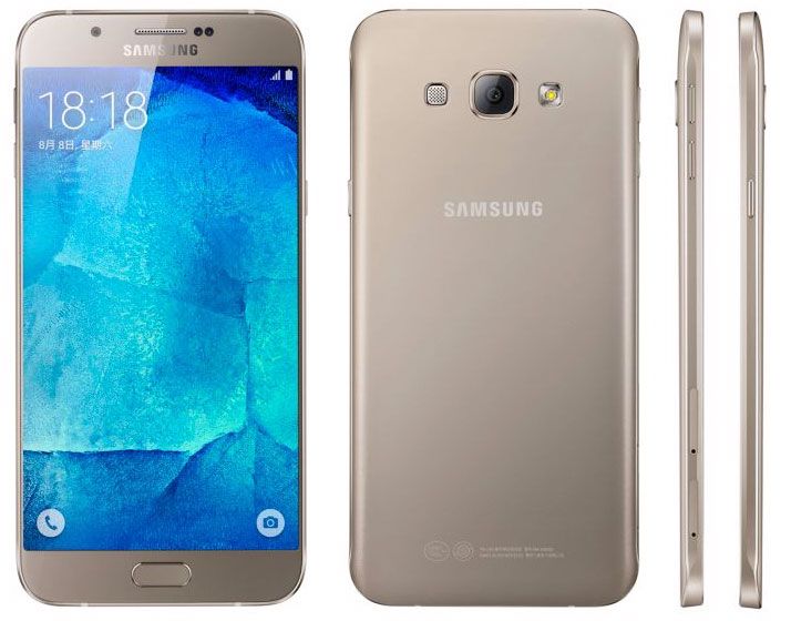 El Galaxy A8 tiene un lector de huellas dactilares en el botón de inicio, doble SIM, soporte para tarjetas microSD (recuperado del S6), 4G LTE, Wi-Fi, Bluetooth 4.1, GPS con GLONASS y soporte para la tecnología de campo cercano NFC. A pesar de su tamaño contiene su peso en 151 gramos (25 g menos que el Note 4).