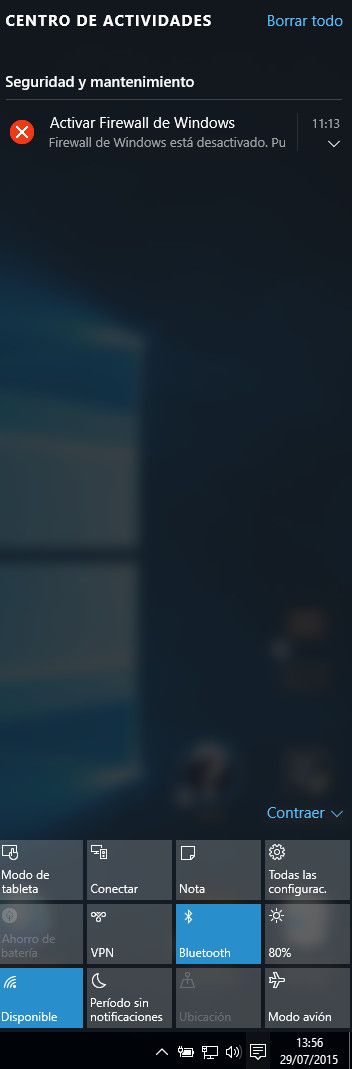 También nuevo el centro de actividades cerrado por defecto y que se activa desde una tecla en la barra. Bien resuelto para nuestro gusto y mucho más útil que la barra escamoteable de Windows 8, ya desaparecida. Incluye las notificaciones, acceso a redes, configuraciones, modo avión, VPN y la función Continuum, que modifica la interfaz dependiendo si estamos trabajando con teclado y ratón en un equipo de escritorio o en un dispositivo con pantalla multitáctil como un tablet.