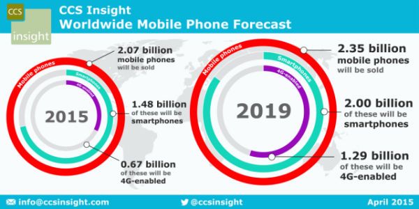 A nivel mundial se espera que en 2019 se vendan 2.350 millones de móviles, de los cuales 2.000 millones serán smartphones, frente a los 1.400 millones de smartphones que se espera que se ventan en el presente año.