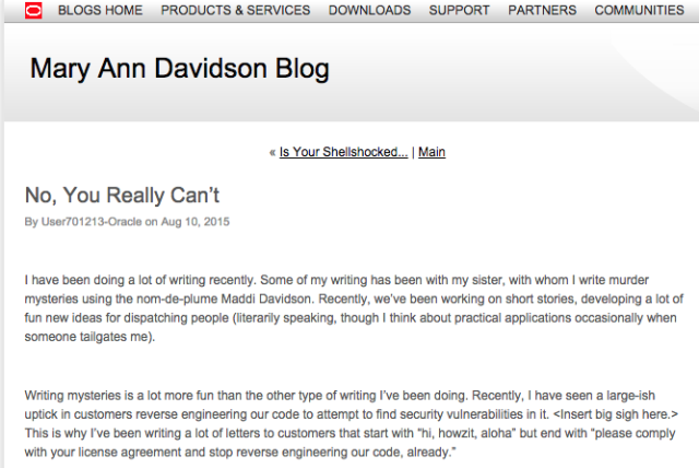 La entrada del blog no tenía desperdicio, y además de todo lo comentado, Mary Ann Davidson ha dicho en nombre de la empresa que requieren que “clientes y consultores destruyan los resultados de la ingeniería inversa y confirmen que lo han hecho”. La entrada fue borrada al día siguiente debido al revuelo causado en Internet, aunque todavía se puede leer desde Seclist.org. A Oracle ha tenido que rectificar diciendo que «trabaja con investigadores terceros y clientes para asegurar conjuntamente que las aplicaciones construidas con la tecnología de Oracle son seguras».