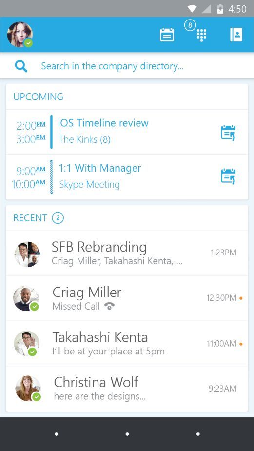 La aplicación para iOS y Android de Skype Empresarial incorporará un nuevo diseño con un barra de búsqueda para poder encontrar más fácilmente los contactos, pudiendo buscarlos a través del nombre, el apellido, su email o incluso su número de teléfono. Para la versión de iOS también se incluirán los contactos guardados en el smartphone en los resultados de búsqueda. Otra de las características que incluirá Skype Empresarial para iOS y Android es la de poder ver las reuniones en un calendario y poder unir a ellas de forma sencilla pulsando un icono. Por su parte las conversaciones recientes hace más fácil el hacer referencias a las más recientes, ya sean chats, llamadas de teléfono o reuniones.