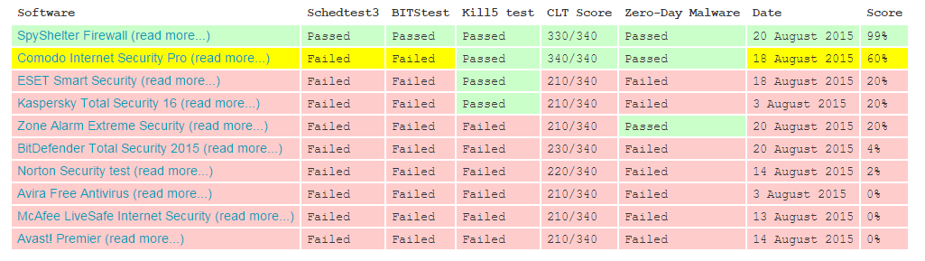 El cuadro que os adjuntamos habla por sí mismo y deja claro que la única solución que sale mínimamente bien parada es la suite de seguridad Comodo Internet Security Pro, consiguiendo una puntuación del 60%, ya que de las restantes ninguna consigue superar el 20%.