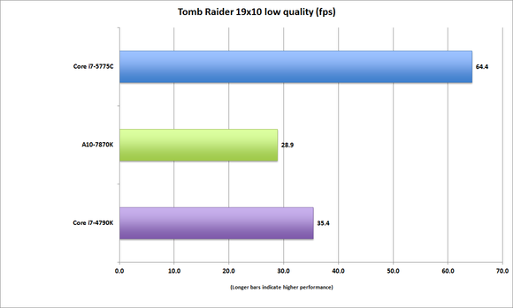 En las tres gráficas que acompañamos al final del artículo tenemos una muestra de su rendimiento en juegos, donde como vemos supera también de largo al de la APU A10-7870K, que monta una GPU Radeon R7 con 512 shaders.