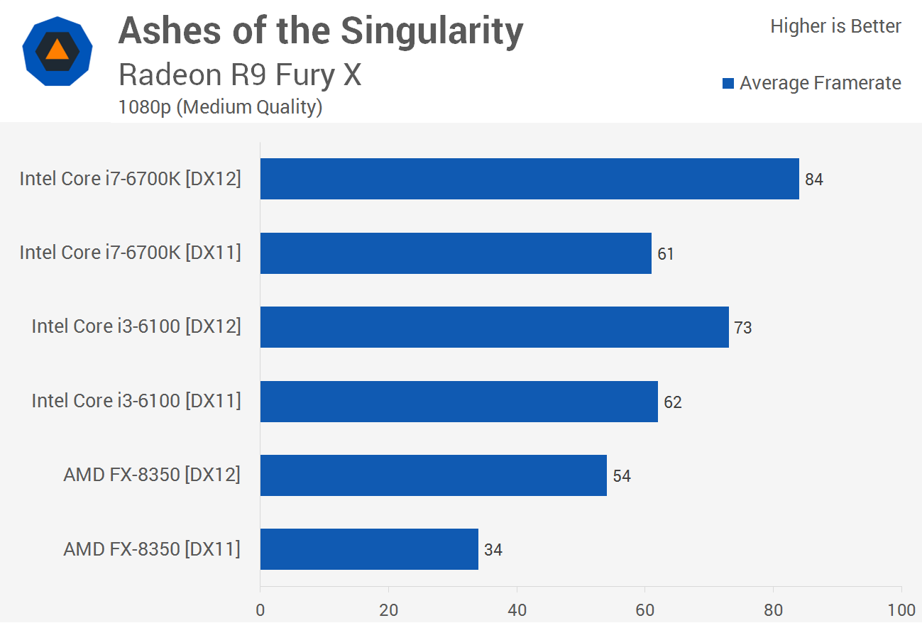 Para comprobar el rendimiento de DirectX 12 frente a DirectX 11 con distintos procesadores y bajo las mismas gráficas dedicadas, se probaron el Core i7-6700K, Core i3-6100 y AMD FX-8350, sobre la GTX 980 Ti y la Radeon Fury X.