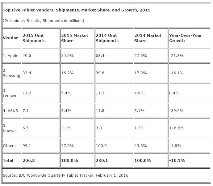 Los tablets Apple dominaron el sector en 2015 pero sufrieron una gran caída de ventas, desde 63 millones en 2014 a 49,6 millones en 2015, para un descenso del 21%. Lo mismo podemos decir de Samsung y ASUS. Solo se salva un Lenovo que se mantiene y el ascenso de Huawei al quinto puesto tras duplicar ventas de 2014.
