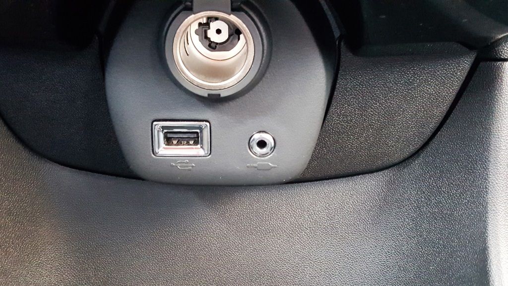 La consola central de diseño vertical es de plástico negro brillante e incluye la pantalla del sistema de información y entretenimiento de siete pulgadas además de los botones del sistema y los controles de los sistemas de climatización. Más abajo encontramos la toma de 12 voltios, el conector USB y la entrada auxiliar para conectar fuentes de sonido portátiles. Finalmente encontramos la palanca de cambios.
