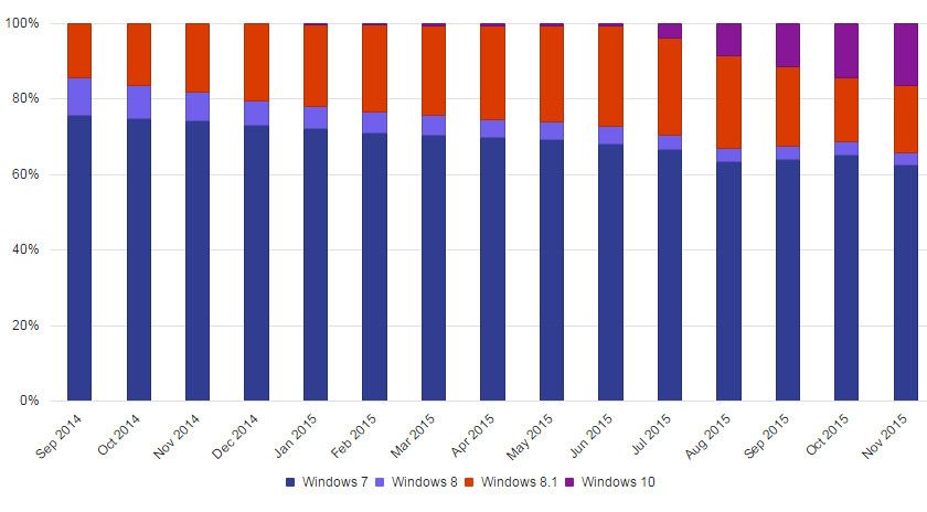 Según los datos de Microsoft, Windows 10 habría alcanzado un 16 por ciento de cuota (entre Windows) en noviembre de 2015, con un grado de adopción similar al de Windows 7 y superior al que mensualmente publican firmas de análisis como NetMarketShare o StatCounter.