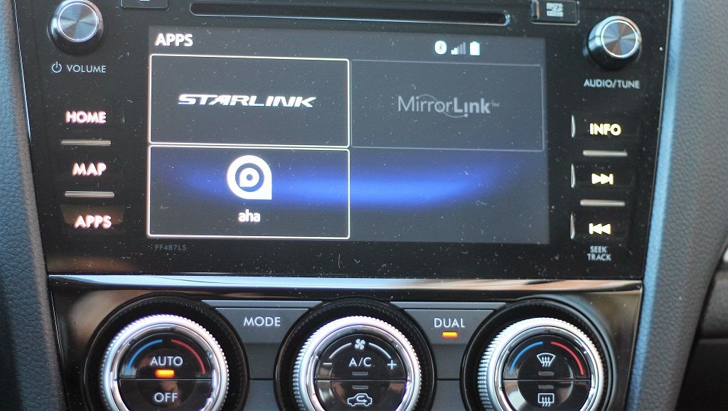 En la pantalla principal, además del mencionado navegador, podremos hacer uso de las aplicaciones del móvil a través del sistema MirrorLink o el propietario de Subaru Starlink. En ambos casos solamente para aplicaciones compatibles. Además ofrece la posibilidad de utilizar el programa Aha de radio por Internet. La pantalla es táctil pero puede manejarse con los botones que rodean a la misma. En la parte inferior los controles del completo sistema de climatización.