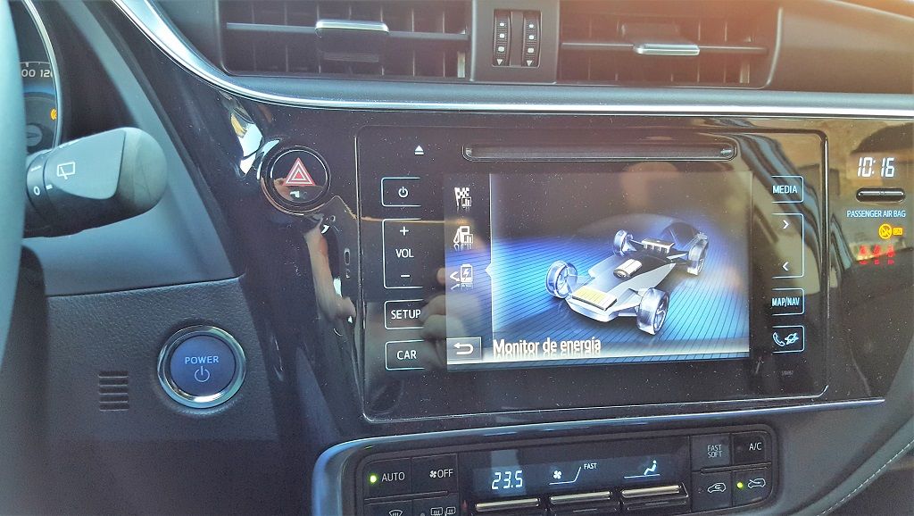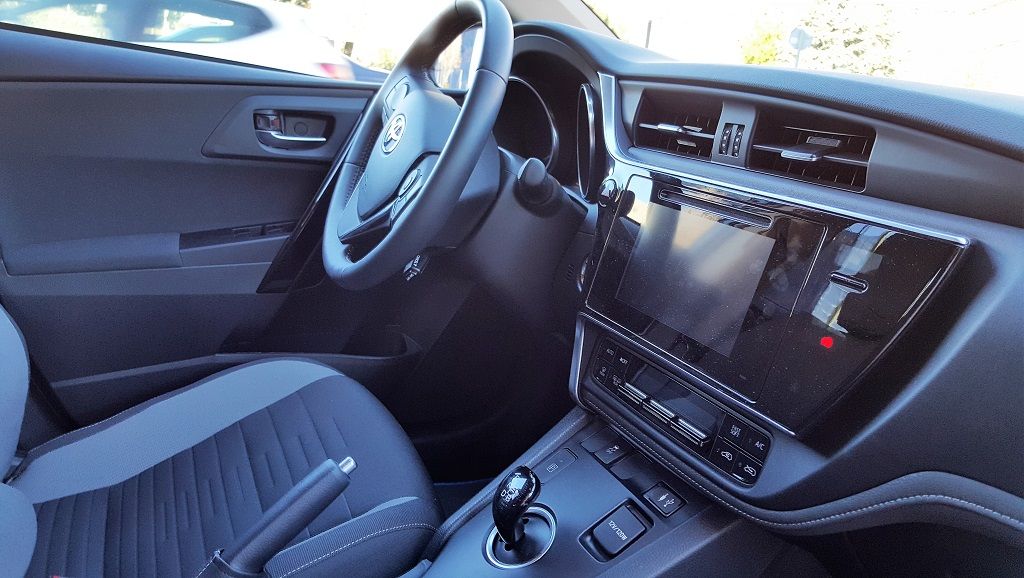 A diferencia por ejemplo del Lexus CT 200 que coloca la pantalla en la parte superior, en el caso del Auris el conductor tiene que desplazar la mirada más abajo, lo cual es menos práctico y puede distraer más de la carretera en determinadas circunstancias. La palanca de cambios (más bien un joystick) de la caja automática está colocada en una posición más tradicional y cómoda aunque en tamaño y su tacto sigue siendo el mismo: algo extraño para los acostumbrados a palancas de cambio tradicionales, tanto manuales como automáticas.