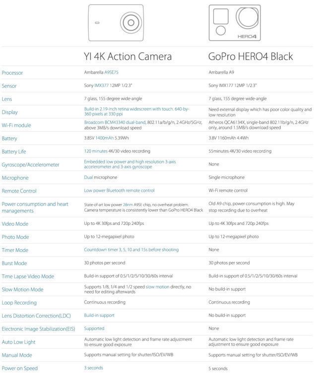 Podemos verlo con más claridad en la hoja comparativa que acompañamos en el artículo, donde aparecen las principales especificaciones de la HERO4 Black y la Xiaomi Yi 4K, y vemos que en definitiva la segunda es claramente superior.