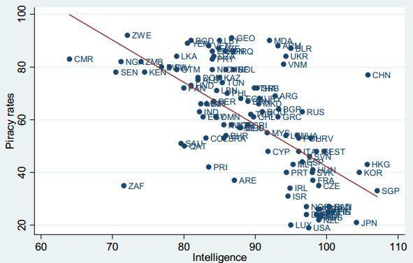 A favor de ese párrafo parece estar un nuevo estudio llevado a cabo por la firma alemana MPRA, en el que constataron que el coeficiente intelectual colectivo, es decir, la media conjunta de cada país, está directamente relacionada con la tasa de piratería del mismo.