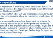 Finalmente tenemos numerosas recomendaciones a los desarrolladores sobre el tema de las resoluciones y la reducción de las mismas a niveles que aunque caigan por debajo de 2160p no lleguen a caer hasta 1440p.