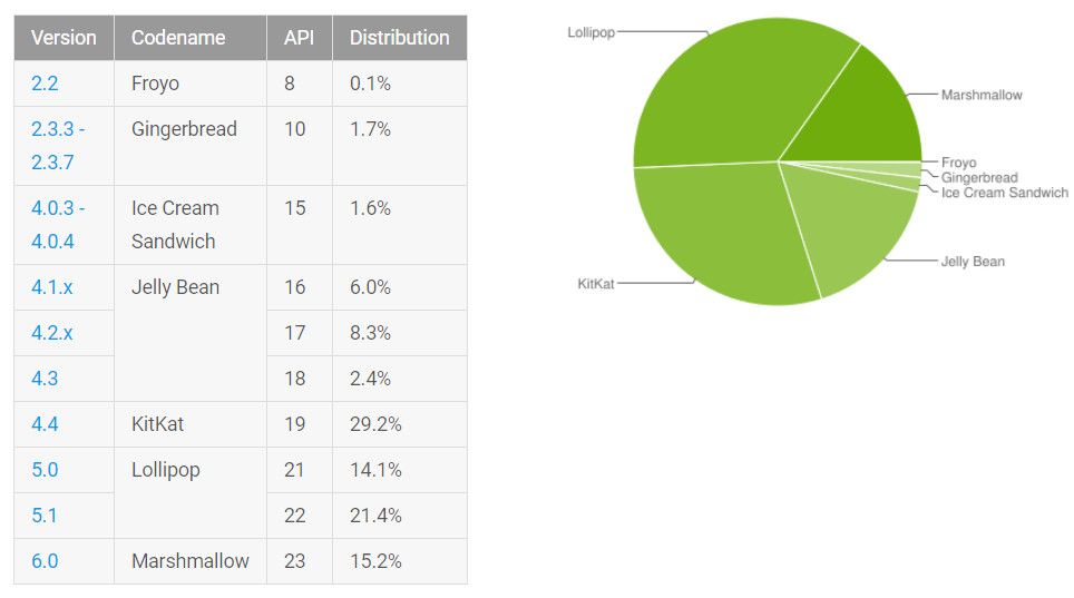 Android 4.4 KitKat, que hasta hace poco era el gran dominador de Android, registró una leve caída que al menos baja del 30%, mientras que Jelly Bean (4.1 a 4.3) baja hasta el 16,7 por ciento. De las versiones 2.2 Froyo a la 4.0.4 Ice Cream Sandwich mantienen una cuota residual por debajo del 2% y se espera que salgan de este tipo de estadísticas el próximo mes.