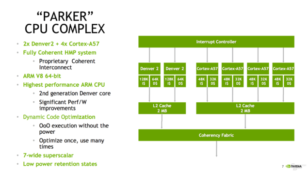 Como podemos ver en la imagen cada SoC Tegra Parker está compuesto de una CPU formada por dos núcleos Denver 2 (diseño personalizado de NVIDIA) y cuatro núcleos Cortex-A57, GPU Pascal con 256 shaders o núcleos CUDA y casi todos los elementos necesarios para el funcionamiento del sistema, incluido el controlador de memoria LPDDR4 de 128 bits.