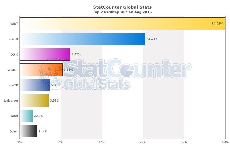 Datos interesantes porque reflejan la situación del mes de agosto, tras la finalización del programa de actualización gratuita y tras el lanzamiento del Windows 10 Annivesary Update.