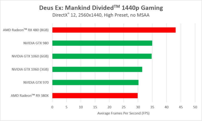 En general todas las soluciones Radeon logran mejorar el rendimiento en Deus Ex: Mankind Divided bajo DirectX 12, cosa que no sólo no ocurre en las GTX de NVIDIA sino que además el cambio a dicha API tiene efectos negativos, tanto que en algunos casos la reducción de fotogramas por segundo llega a ser muy grande.