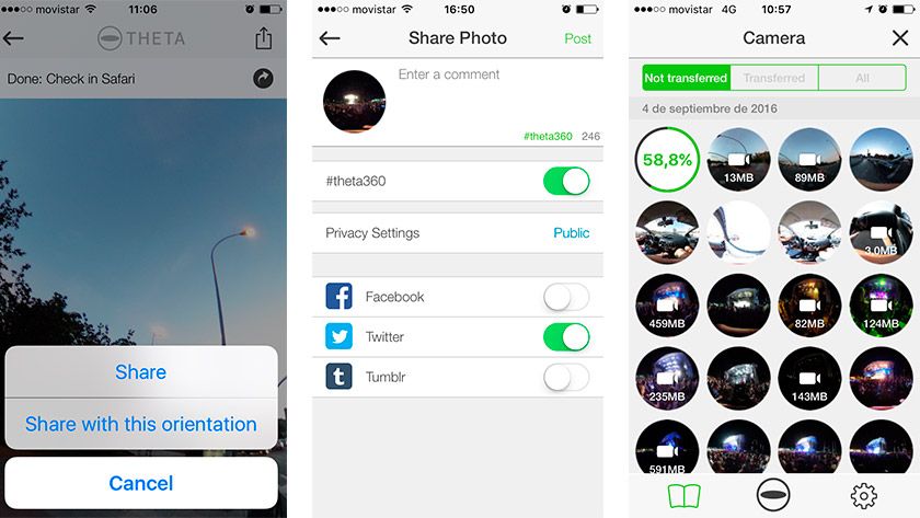 Este dispositivo ofrece la posibilidad de compartir nuestras fotos y vídeos a través de Facebook, YouTube o la plataforma theta360.com, propietaria de Ricoh. Compartir en Facebook es muy sencillo y se puede hacer directamente desde la app (tenéis un ejemplo aquí), pero en el caso de YouTube necesitamos recurrir a un PC o Mac y dedicar un rato a procesar los archivos e insertar los metadatos para conseguir que sea compatible y se pueda ver en cualquier equipo, operación que no resulta ni rápida ni inutitiva.