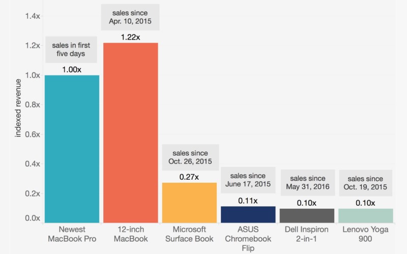 En la gráfica que véis adjunta se comparan las ventas del nuevo equipo de Apple con otros portátiles de gama alta, como el Microsoft Surface Book, el ASUS Chromebook Flip, el Lenovo Yoga 900 o el MacBook que ya conocíamos; así, el MacBook Pro ha vendido cuatro veces más que la propuesta de Microsoft y casi diez veces más que cualquiera de sus rivales.