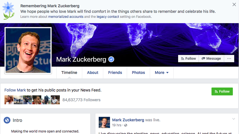 La conocida red social mostró el pasado viernes una mini necrológica que Facebook utiliza para aquellos que quieran rendir homenaje y mantener las cuentas de usuarios fallecidos en el perfil de buena parte de sus usuarios, un error del que no se salvó ni siquiera el propio Mark Zuckerberg.
