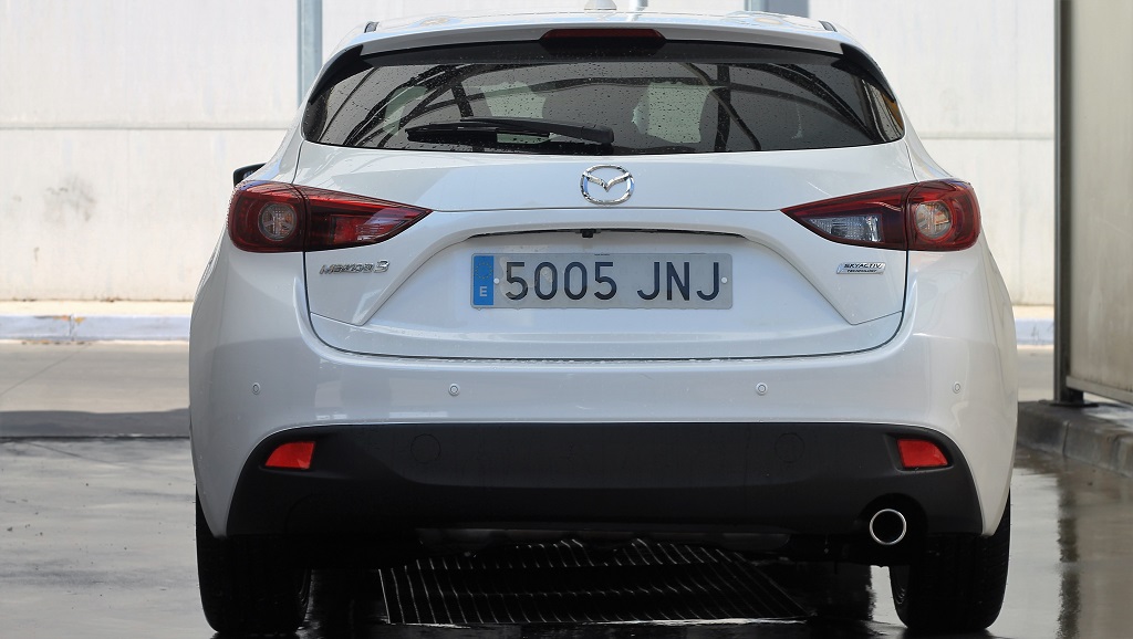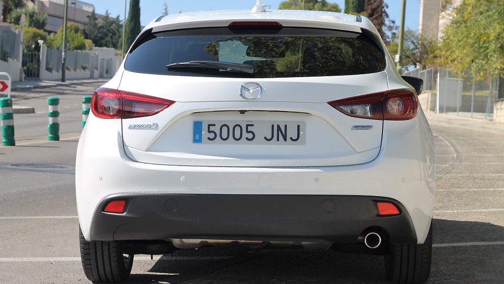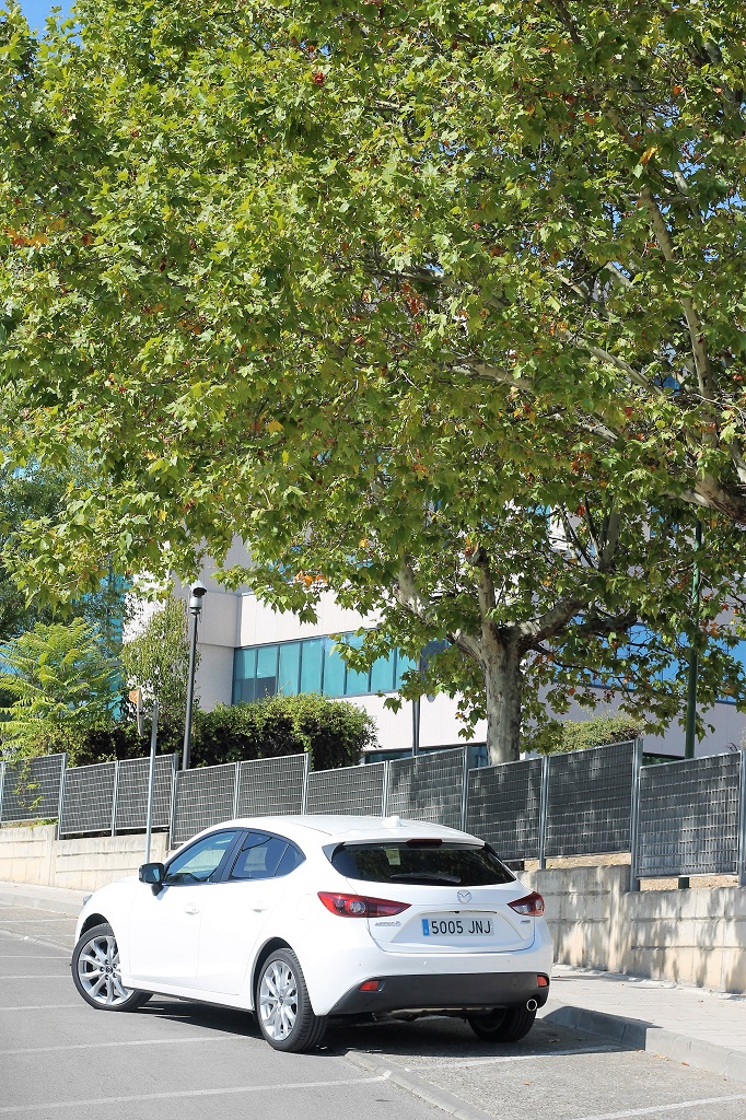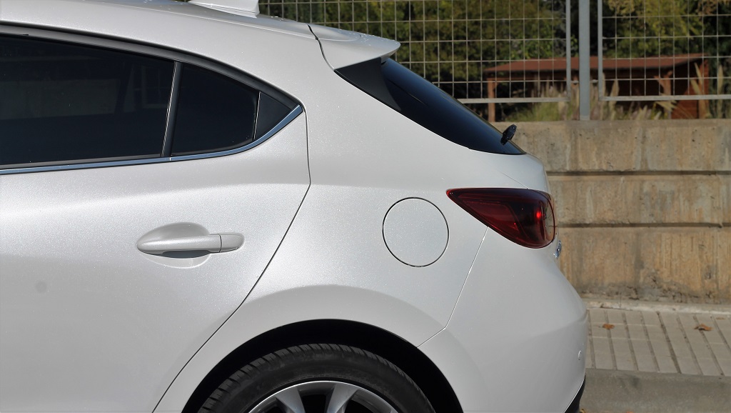Pero cerremos el capó por un momento, demos unos pasos atrás y admiremos el diseño del Mazda 3. Es muy difícil encontrar en un coche compacto como este modelo japonés una línea que se acerque tanto al compromiso perfecto entre deportividad y elegancia acudiendo a la clásica forma de lágrima. Desde los afilados grupos ópticos marca de la casa hasta el discreo spoiler trasero en forma de visera es complicado buscarle peros a este coche, sobre todo si como en este caso no hay grandes sacrificios en habitabilidad y visibilidad, aunque algo limitada en la luneta posterior.