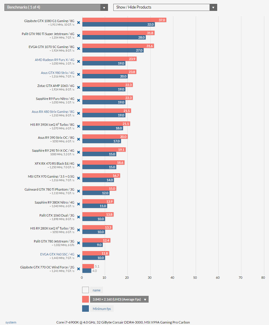Si elevamos la resolución a 1440p el mínimo recomendable para evitar tirones sube a una Radeon Fury-RX 480 o una GTX 1060 de 6 GB. Finalmente en resoluciones 4K la única que logra mantenerse por encima de los 30 FPS con el nivel de calidad en ultra es la GTX 1080.