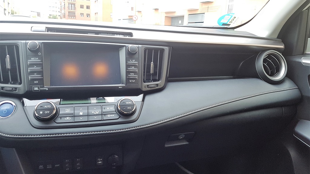 El sistema de información y entretenimiento del RAV 4 incluye en este caso la información del funcionamiento del sistema híbrido con gráficas que nos indican cuando se están cargando las baterías y en qué momento entra en funcionamiento cada sistema de propulsión. El sistema ofrece una pantalla de siete pulgadas en la parte frontal y otra de 4,2 pulgadas tras el volante, entre el potenciómetro que hace las veces de cuentarrevoluciones y el velocímetro.