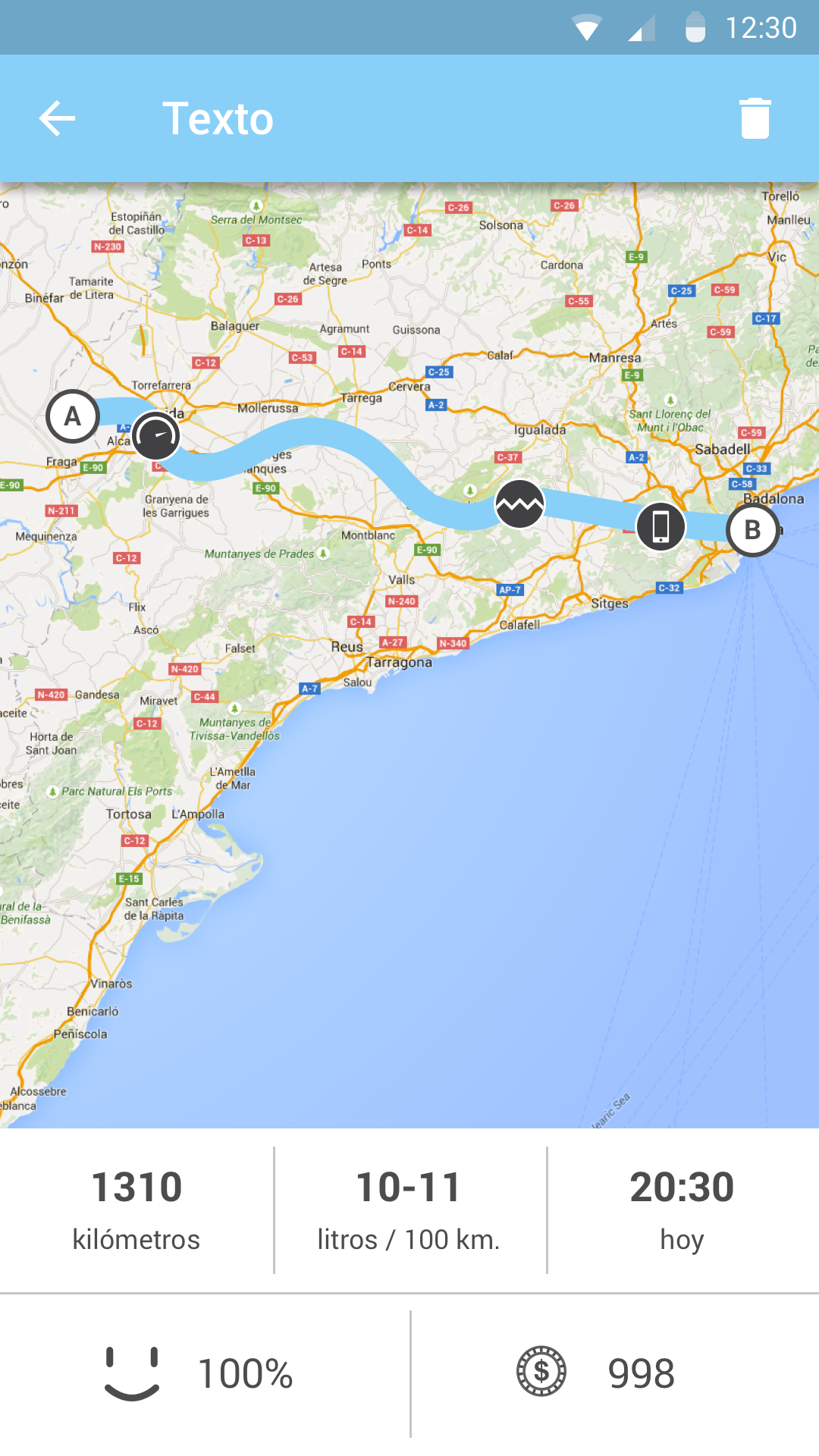 Pero esto no es todo, también nos mostrará información muy útil sobre el consumo estimado de combustible, la duración exacta del trayecto y los kilómetros recorridos.