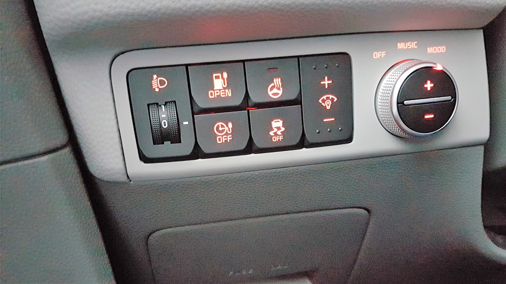Los controles están todos a mano y son cómodos de accionar, bien visibles tanto a la luz del día como a oscuras. En la parque izquierda tras el volante hay un grupo de controles curioso que une la apertura del compartimento de los conectores de carga, la regulación de la luz de ambiente (como la de los altavoces), la desconexión o conexión del ESP, regulación de la luz del cuadro de instrumentos, activar la calefacción del volante… A ciegas es posible accionar una cosa por otra aunque no son funciones de uso durante la marcha.