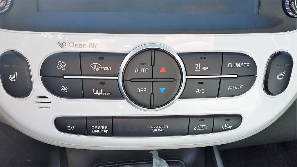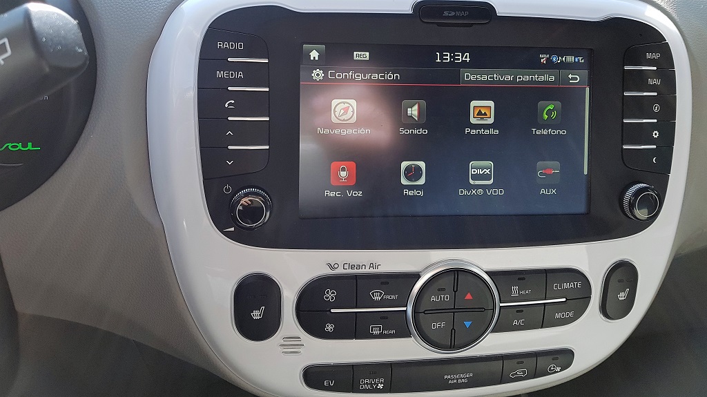 Nos gusta la filosofía de aportar botones de acceso rápido además de la pantalla táctil para ahorrar tiempo y no distraer demasiado de la conducción. Diez botones accesibles directamente además del dial de volumen y el de selección. Por debajo los mandos de climatización con la peculiaridad del botón que permite accionar la misma solamente para el conductor para el ahorro de energía, muy importante en un coche eléctrico que se encomienda únicamente a la electricidad para enfriar o calentar el habitáculo (esto último lo que más consume).