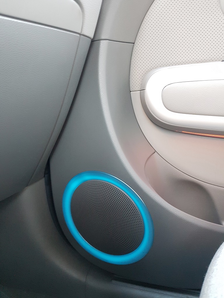 Por ejemplo los altavoces de las puertas delanteras están rodeadas por una luz led que cambia de color. Podemos configurar este cambio de color según la música o del humor que estemos. El salpicadero y las puertas están bien acabados, con plásticos de calidad blandos en la parte superior del salpicadero y de las puertas. El plástico rugoso del resto de las superficies es más de «batalla» pero bien ensamblado, buena calidad para un coche urbano.