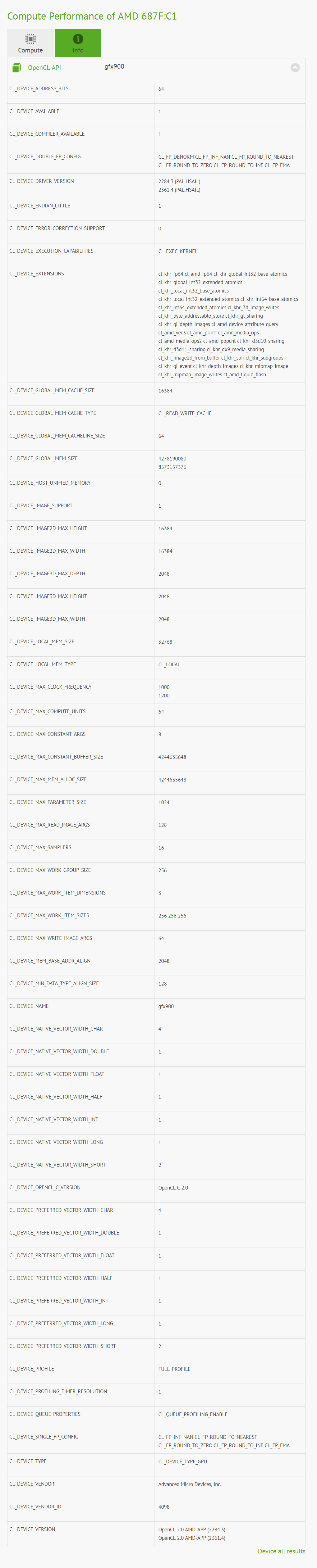 Ese listado nos permite confirmar un dato muy interesante, las 64 unidades de computación, lo que multiplicado por los 64 shaders que monta cada una nos deja un total de 4.096 shaders, la misma cantidad que venían apuntando todos los rumores que hemos visto hasta la fecha.