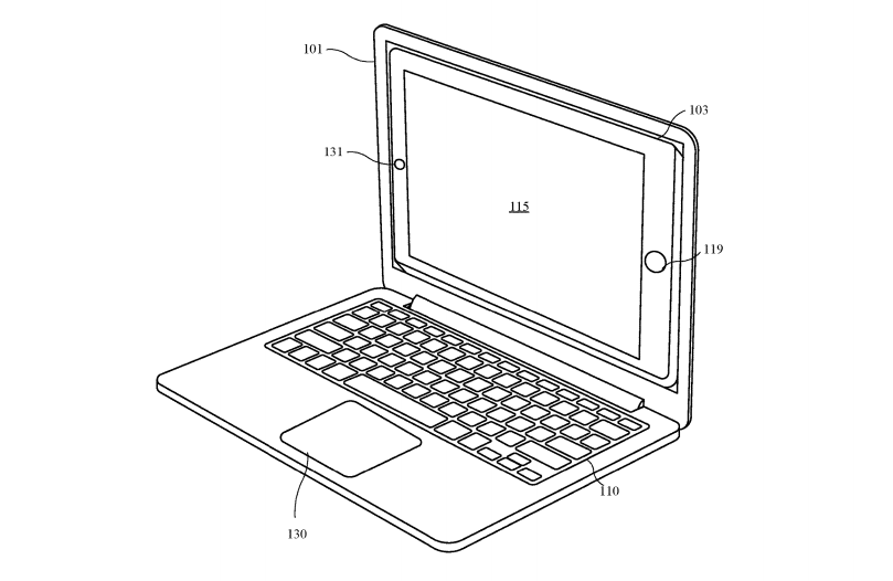Finalmente, aunque no por ello menos interesante, el gigante de Cupertino también recoge en la patente un diseño que muestra una versión adaptada de ese mismo dock para albergar un iPad. Obviamente la pantalla de aquél sí sería táctil, pero igualmente contaría con una almohadilla táctil en la parte baja.