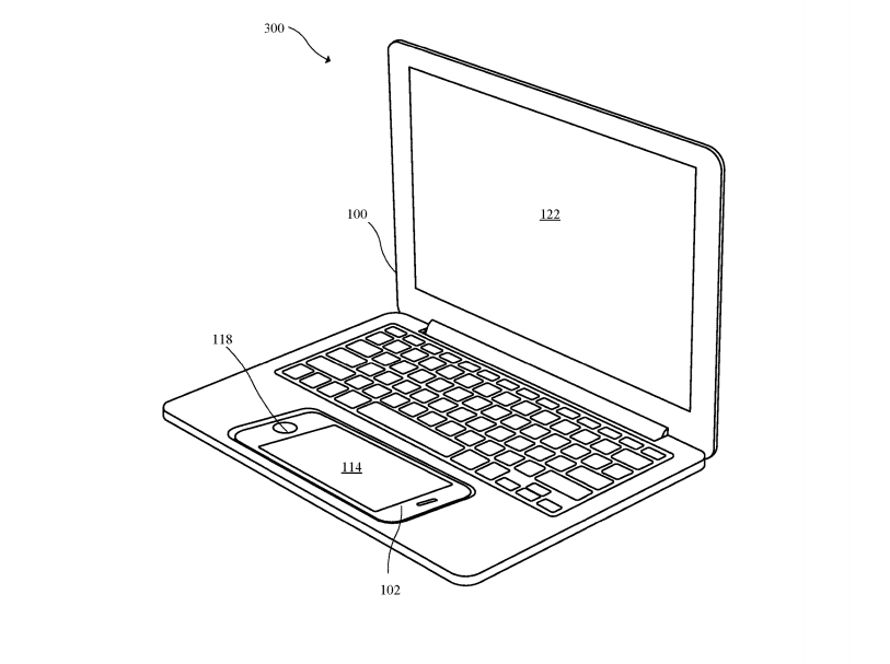 En primer lugar debemos tener en cuenta que la patente contempla la integración del iPhone justo en la zona en la que normalmente tenemos una almohadilla táctil, lo que significa que podríamos controlar cómodamente la interfaz del terminal con los dedos y utilizar el teclado.