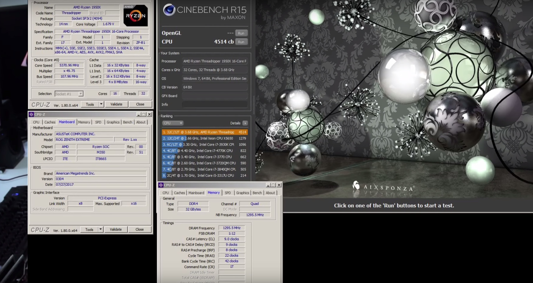 Las dos imágenes que tenéis justo debajo muestran una comparativa de la puntuación obtenida por el Core i9 7980XE a 6,1 GHz y la que consiguió el Threadripper 1950X a 5,37 GHz. Es importante tener en cuenta que el modelo de AMD tiene 16 núcleos y 32 hilos (dos núcleos y cuatro hilos menos).