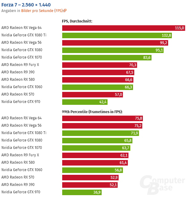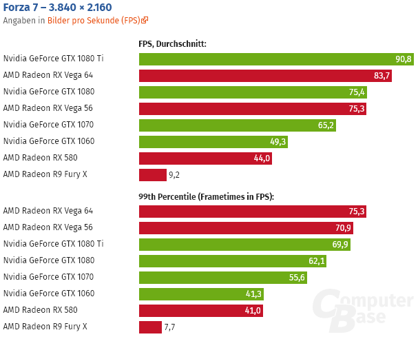 Aunque la optimización es buena Forza Motorsport 7 presenta una fuerte dependencia de la memoria gráfica, algo que se deja notar en los malos resultados que logra la Radeon Fury X al subir la resolución a 4K.