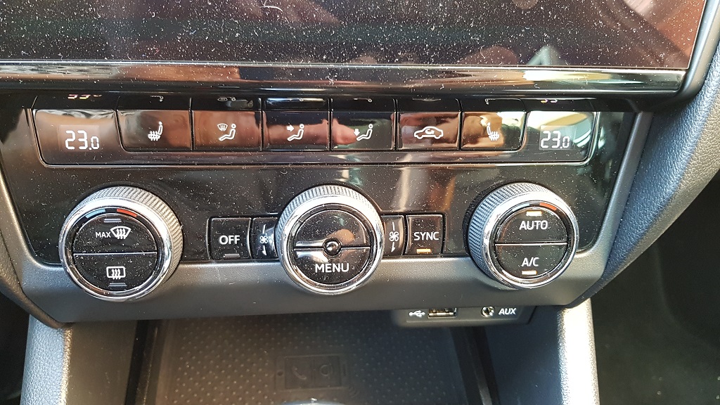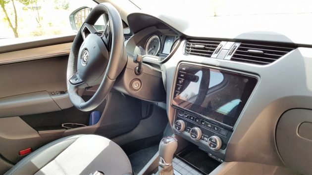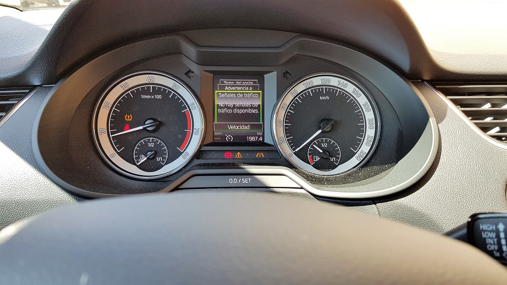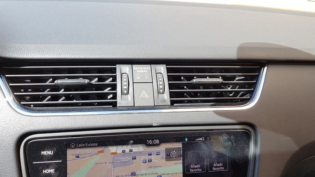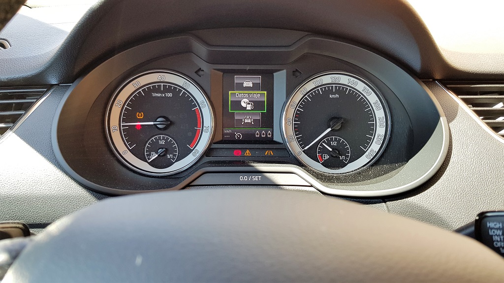 Una peculiaridad es que tendremos indicadores de capacidad de los dos depósitos, el de gas y el de gasolina, y el ordenador de abordo nos dará información detallada del consumo, autonomía y demás de cada uno de los sistemas de combustión. En el centro de la consola encontramos la pantalla del sistema de infotainment de 9,2 pulgadas. Dicho sistema es uno de los puntos fuertes del Skoda con capacidad de conexión SmartLink que permite conectarse a Android Auto, Apple Car Play o MirrorLink además de conectividad completa Bluetooth, reproducción de USB y otras funciones.