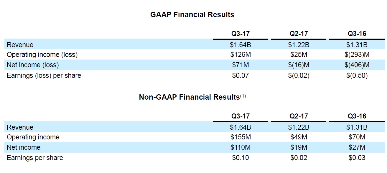 - Sobre una base non-GAAP los ingresos operativos fueron de 155 millones de dólares; los ingresos netos fueron de 110 millones de dólares y las ganancias por acción fueron de 0,10 dólares.