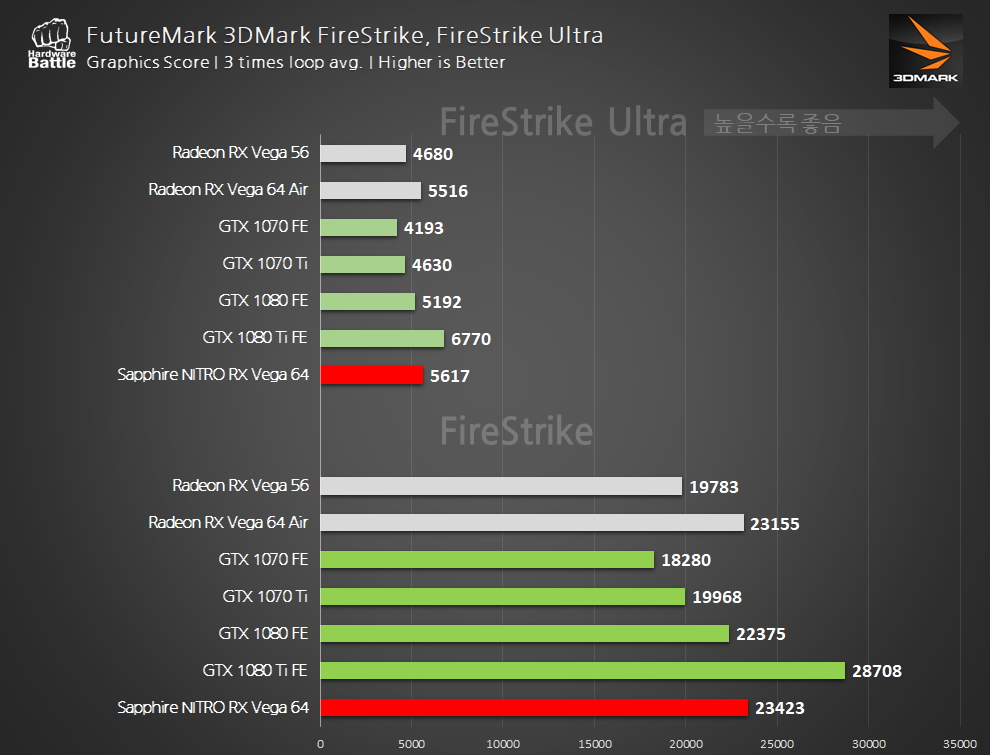La pequeña ganancia de rendimiento que veis en dicha gráfica frente a la Radeon RX Vega 64 basada en aire se debe únicamente a la mayor calidad del sistema de refrigeración de la versión de Sapphire, que permite mantener máximos de frecuencia dinámica durante periodos más largos.