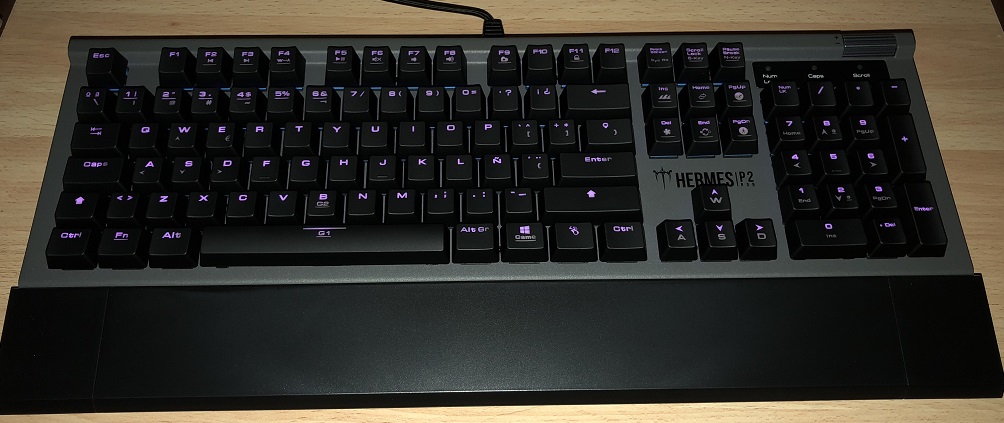 Por lo demás tenemos el ya citado sistema de iluminación LED RGB totalmente personalizable y un reposamuñecas terminado en plástico duro. Los interruptores del HERMES P2 RGB Gaming son «Blue» y están basados en un sistema óptico que vemos perfectamente explicado en el vídeo adjunto.