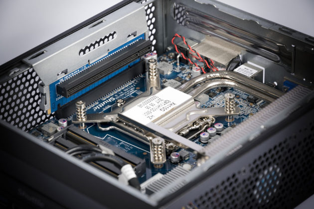 La calidad de construcción del Shuttle XH110G es sublime y el nivel de ensamblaje sobresaliente. Los ingenieros de la compañía han adaptado una placa personalizada que ofrece un socket LGA 1151, dos slots de RAM DDR4 que soportan configuraciones de hasta 32 Gbytes y una ranura M.2 SATA ideal para conectar una unidad SSD. A nuestra disposición, ofrece una bandeja para instalar un disco duro adicional y así combinar lo mejor de los dos mundos.