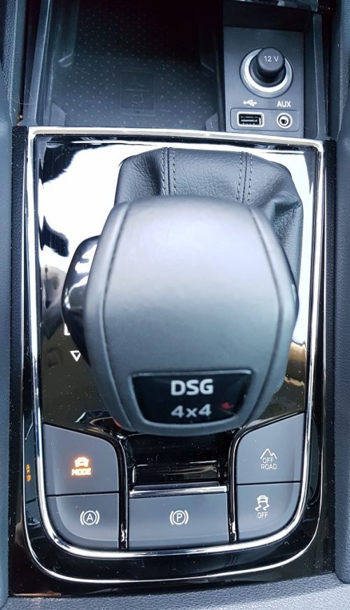 Como casi todos los SUVs el Kodiaq no está pensado para funcionar como todoterreno, aunque dispone de una buena altura desde el suelo. Sin embargo y utilizando el selector junto a la palanca de cambios podemos aventurarnos fuera de la carretera sin problemas y afrontar todo tipo de terrenos con bastante facilidad, tanto barro como incluso pequeños vadeos. El motor de gasolina aquí sí que muestra sus limitaciones por su baja cifra de par por lo que el cambio automático no tiene más remedio que revolucionar mucho el coche para superar obstáculos empinados.