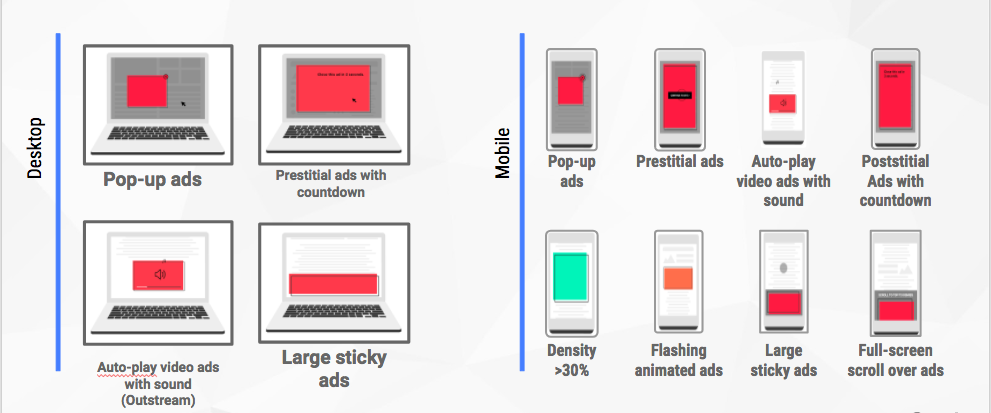 Los anuncios bloqueados incluyen los pop-ups; los anuncios sonoros automáticos; anuncios Prestitial que ocupen gran parte de la pantalla y los animados en Flash; los que cubren una gran cantidad de pantalla incluso cuando se desplazan; los Postitial con cuenta atrás en los dispositivos móviles y los anuncios que ocupan más del 30% de la pantalla de un dispositivo móvil.