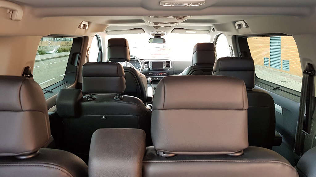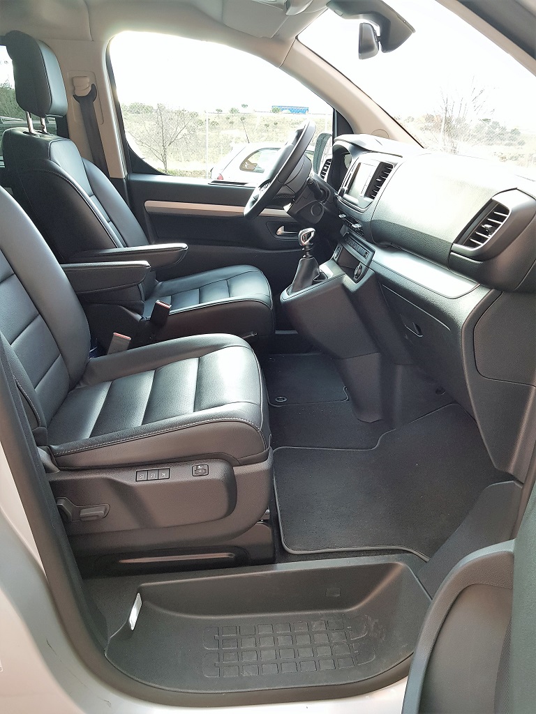 Antes de adentrarnos en el ProAce Verso hay que decir que la versión que hemos probado es la VIP, la destinada a transporte premium de personas y es algo que vamos a notar en cuanto echemos el primer vistazo. En primer lugar la configuración es de siete plazas, todas ellas individuales con asientos de cuero y con posibilidad de configuración para acomodar de la forma más confortable a los ocupantes. Las plazas delanteras tienen una configuración clásica de furgoneta, en la parte del conductor la posición es erguida con muy buena visibilidad gracias al enorme parabrisas.