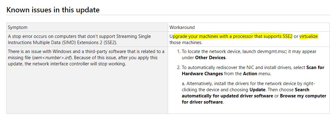 Sin embargo, y tal y como recogen los compañeros de Ghacks, hace unos días Microsoft modificó sus recomendaciones de seguridad y se limitó a eliminar el problema, sin dar mayor información. Un vistazo a documentos anteriores (como este de mayo) revela que, en lugar de actualizar el sistema operativo, la compañía se limita a indicar que Windows 7 no funcionará y recomienda el cambio de procesador o la virtualización.