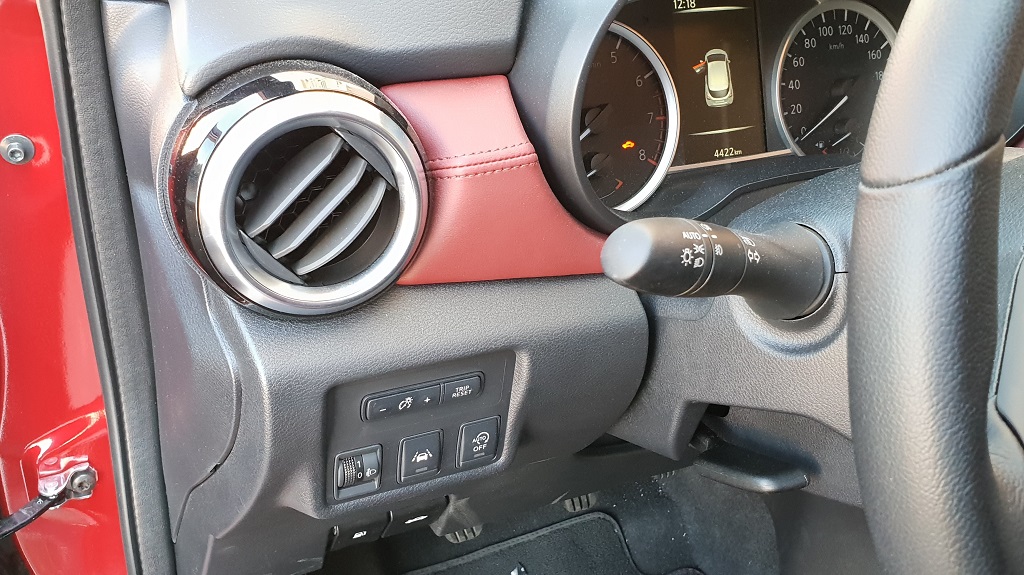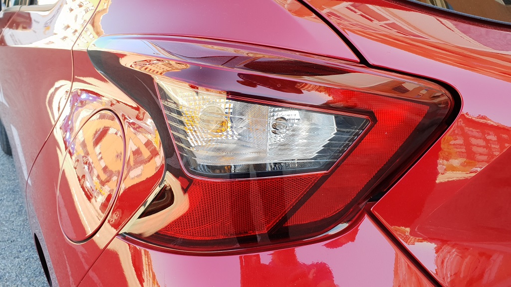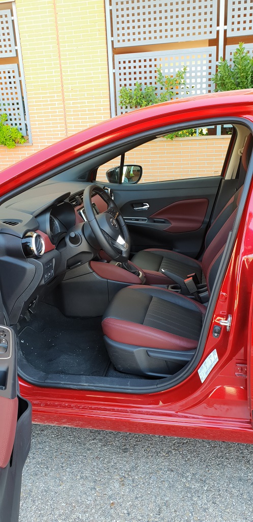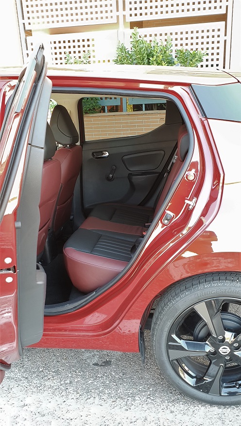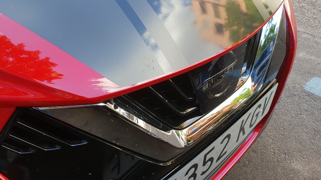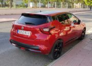 En el vehículo que probamos se ha elegido una combinación realmente atractiva entre negro para el capó, el perfil de las ventanillas, los retrovisores y otros elementos como la parte inferior de los costados y rojo para el resto de la carrocería. Esta mezcla nos ha parecido acertada para subrayar el caracter moderno y algo deportivo del conjunto, subrayado por un discreto spoiler trasero y unas agresivas llantas negras con estética muy «racing». La curiosa forma de los grupos ópticos traseros, muy en línea con su primo el Nissan Juke, le dan otro toque japonés que no desentona con el conjunto.