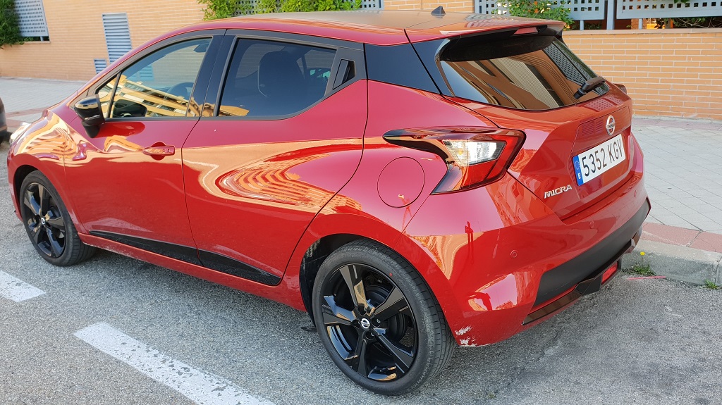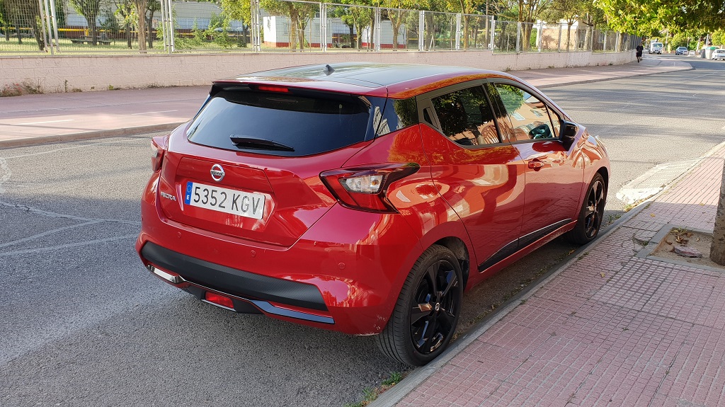 Una decisión curiosa por parte de Nissan al tratarse de un utilitario es que esta nueva generación e Micra no estará disponible más que en carrocería de cinco puertas. Aunque como hemos dicho la decisión de incorporar las manillas de acceso posteriores a la carrocería camuflándolas en el mismo color y poniéndolas al ras del pilar C del coche hacen que la línea del coche no se resienta en absoluto aún dejando espacio suficiente para un cómodo acceso a las plazas traseras. La línea de esta parte trasera hace que las ventanillas traseras sean algo estrechas en este punto, aunque al llegar al portón de atrás el cristal se ensancha y compensa algo esa falta de visibilidad y de luz.