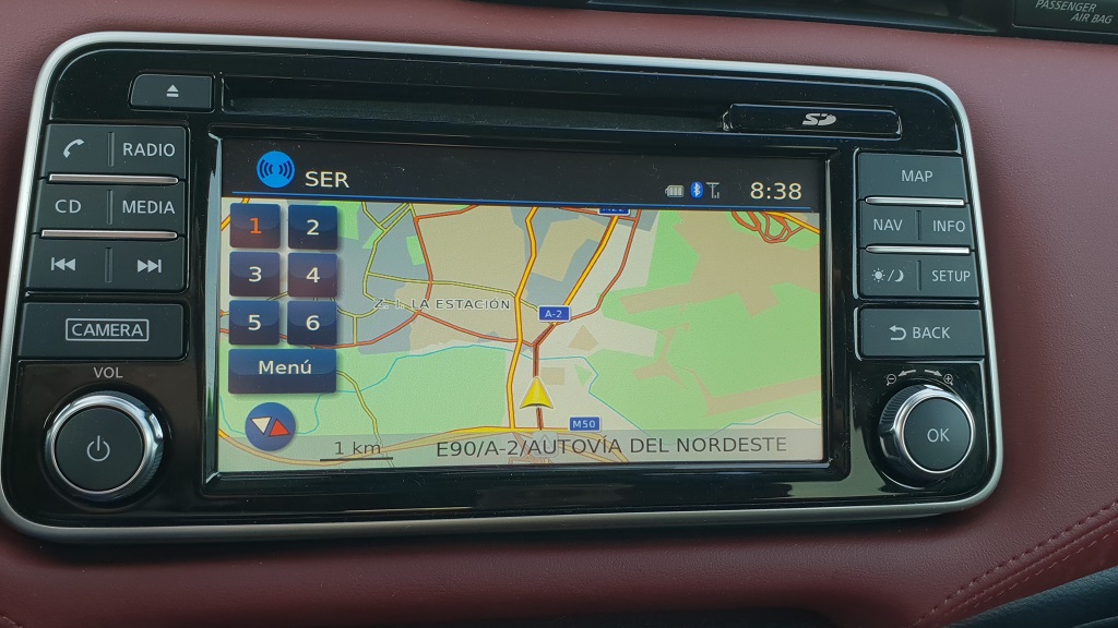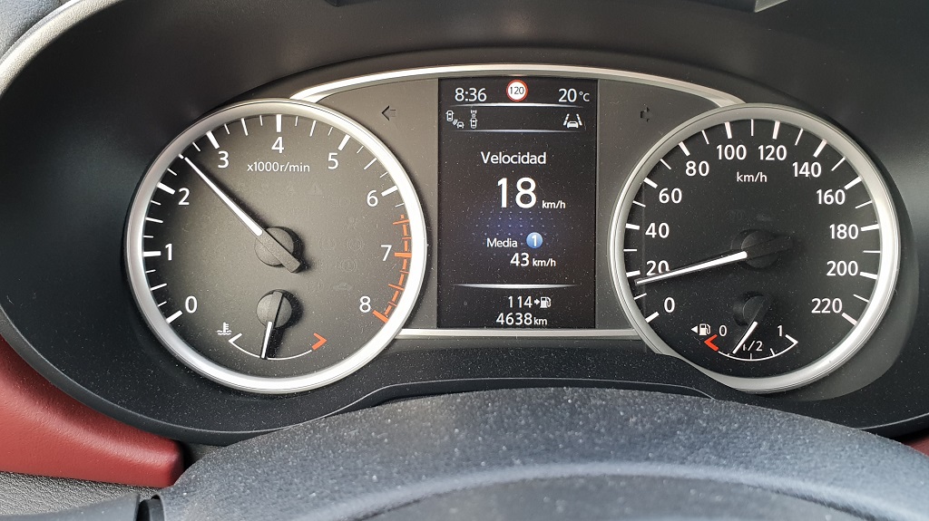 En la parte de información de abordo encontramos los dos indicadores circulares tradicionales de velocidad y revoluciones divididos por una pantalla en color que proporciona información diversa sobre el funcionamiento del coche así como de la ruta recorrida. Como hemos apuntado en el centro del salpicadero, tanto en longitud como en altura, se encuentra la pantalla de 7 pulgadas del sistema de información y entretenimiento. Es una pantalla táctil con una visibilidad bastante buena si la luz no es muy intensa y responde bien al acceder a los menús aunque con algo de lentitud en algunas funciones y unos elementos gráficos algo anticuados, sobre todo para el look moderno del coche.