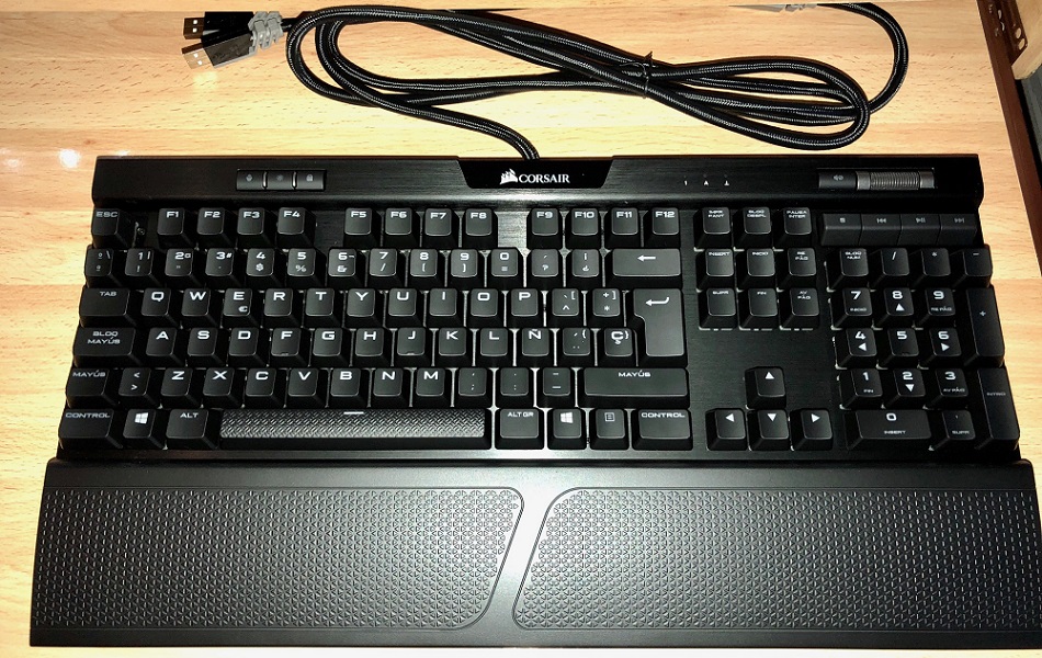 El CORSAIR K70 RGB MK.2 tiene una calidad de construcción perfecta que se deja notar en todos los detalles: desde el aluminio que lo recubre hasta el conector mallado que protege el cableado, sin olvidarnos además del reposamuñecas, que está fabricado en plástico duro y presenta un tacto muy bueno. Una vez colocado queda perfectamente encajado y no se mueve lo más mínimo, ni aunque levantemos en peso el teclado para moverlo.